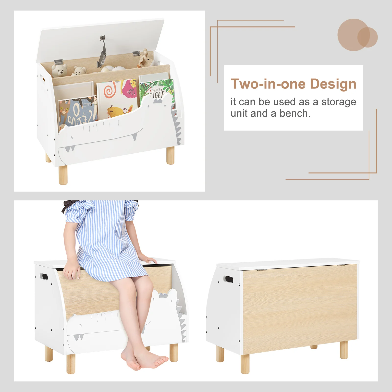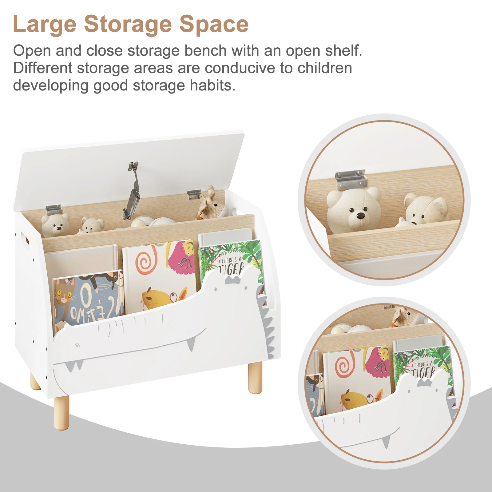 This MontessoriNest Kids Bookshelf is sturdy and safe, made from high-quality MDF with solid wood legs. Its rounded corners and slow-closing lid protect children from bumps and pinches. Designed at a child-friendly height, it encourages organization by storing toys, clothes, and books separately. The playful crocodile design adds charm while serving as a versatile storage bench or seat, perfect for any child's room. Easy to clean and assemble, it supports healthy storage habits and comfort.